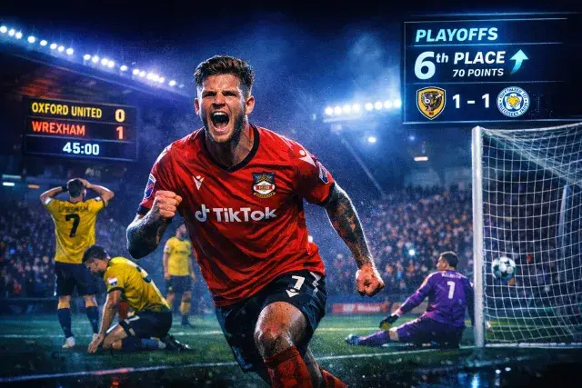 Wrexham secured a 1-0 victory against Oxford United at the Kassam Stadium, propelling them back into the Championship playoff positions. Josh Windass scored the decisive goal five minutes before halftime, marking his fifth in six outings and underscoring his pivotal role in the club's push. This result, coupled with Hull City's draw against Leicester City, elevates Wrexham to sixth place on 70 points, level with Hull but ahead on goal difference, keeping their Premier League aspirations alive in their first season at this level.